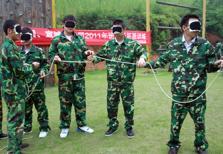 拓展项目描述:小组全体成员在蒙住双眼的情况下,将一些绳子围成一个正方形,并且要求所有的学员均匀地分布在正方形的四条边上。(推荐理由:有助于培学员养主动沟通的意识,体验不同沟通技巧,锻炼团队解决问题的综合能力,拓展训练领导力和统筹能力。)