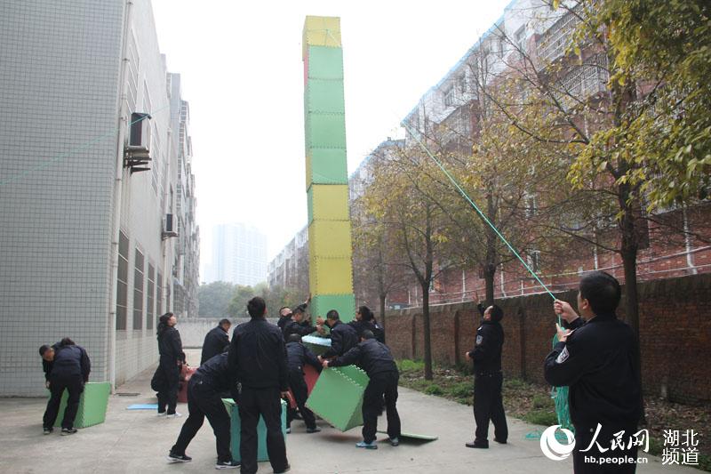 当天,在仙桃市行政学院校务委员、教育长翟国斌的现场指导下,来自基层所队的20余名公安民警,组成若干小组,分工协作,接力建造,在规定的40分钟时间内,将“通天塔”搭建成功。